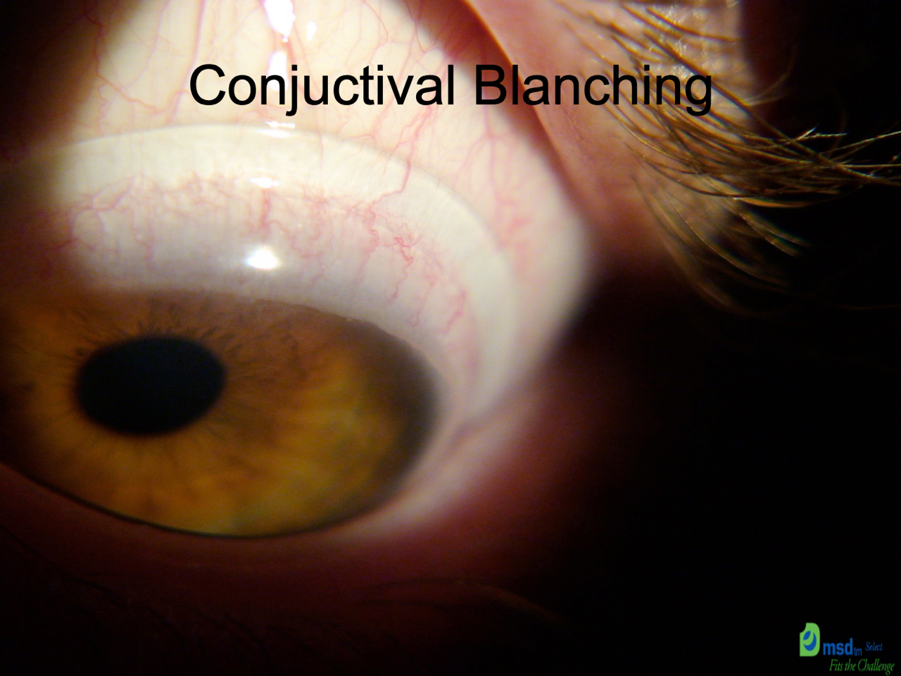 When conjunctival impingement occurs showing excessive blanching; order a lens with a flatter edge, either 1-Flat or 2-Flat. Depending on the lens diameter, increase the profile, increase the sag, or depending on the severity, consider all three options simultaneously.
