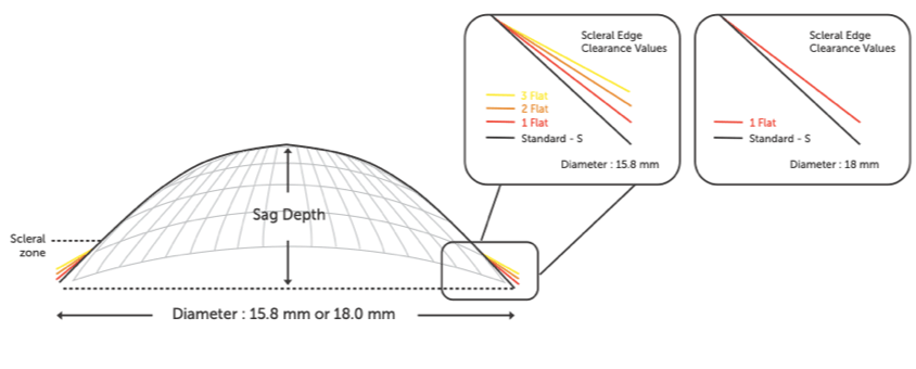 Please remember the same rule applies for the TLZ as for the dperical lenses, calculated from the flat each step flatter equals a drop in actual height. Example: switching from a ST/F1 to a ST/F2 is a 100 micron central lowering and you just need to be aware and may need to compensate for the loss in tear layer thickness!
