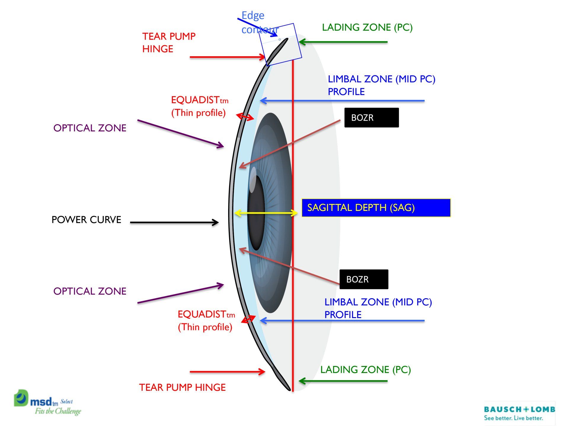 If excessive central touch and bubbles for in the scleral area, the lens is not properly aligned with the sclera but instead is rocking on the cornea. The wearer may also complain of edge awareness in this situation. To correct, increase the sag depth value.
